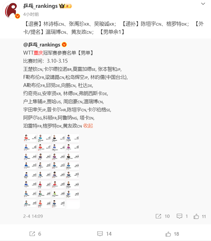 北京时间3月4日,WTT重庆冠军赛外卡名单已经确定,黄友政、温瑞博两位国乒小将入选,重庆冠军赛将在3月10日开打。根据WTT官方的消息,林诗栋、张禹珍、吴晙诚选择退赛,递补陈垣宇、格罗特。国乒核心林诗栋退赛,等于是陈垣宇递补,陈垣宇在WTT新加坡大满贯进入了男单八强,林诗栋也是止步新加坡大满贯的八强。林诗栋在新加坡大满贯两项都不敌小勒布伦,男双决赛林诗栋/黄...