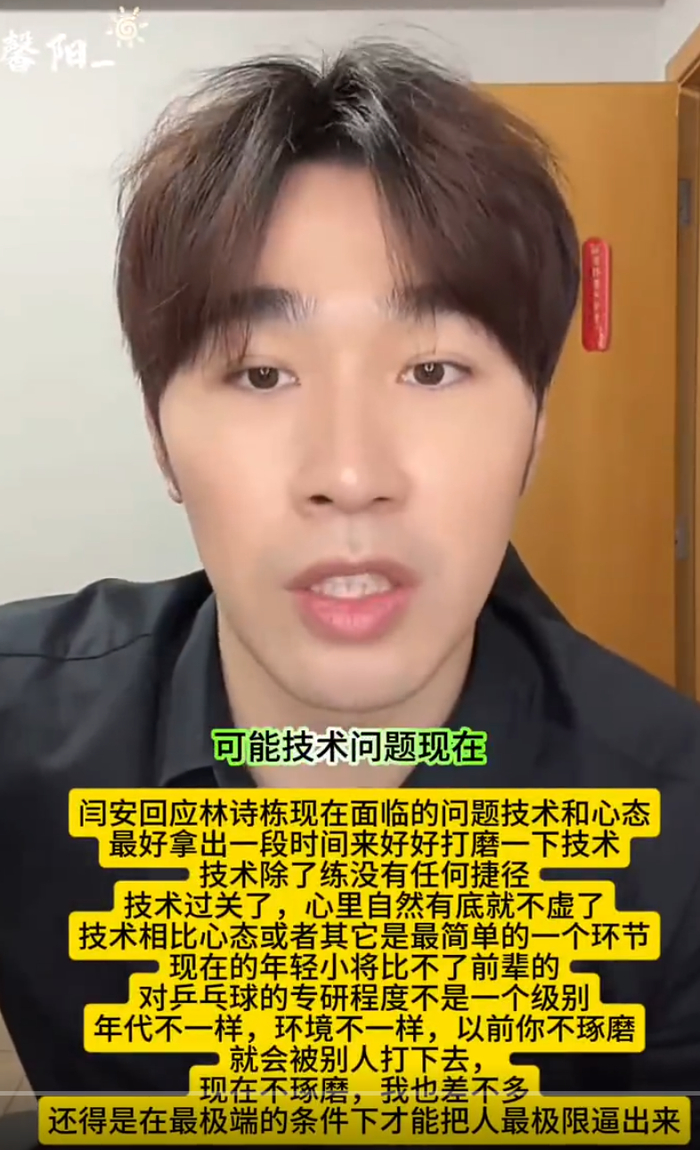闫安则在直播间评价林诗栋:他现在面临的问题是技术与心态双重,最好拿出一段时间来好好打磨一下技术,技术除了练没有任何捷径,技术过关了,心里自然有底就不虚了。技术相比心态或者其它是最简单的一个环节,都需要打磨、琢磨。